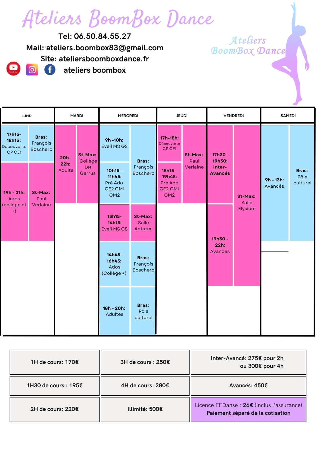 Tous les chèques doivent être établis à l’ordre de Ateliers Boombox Dance.